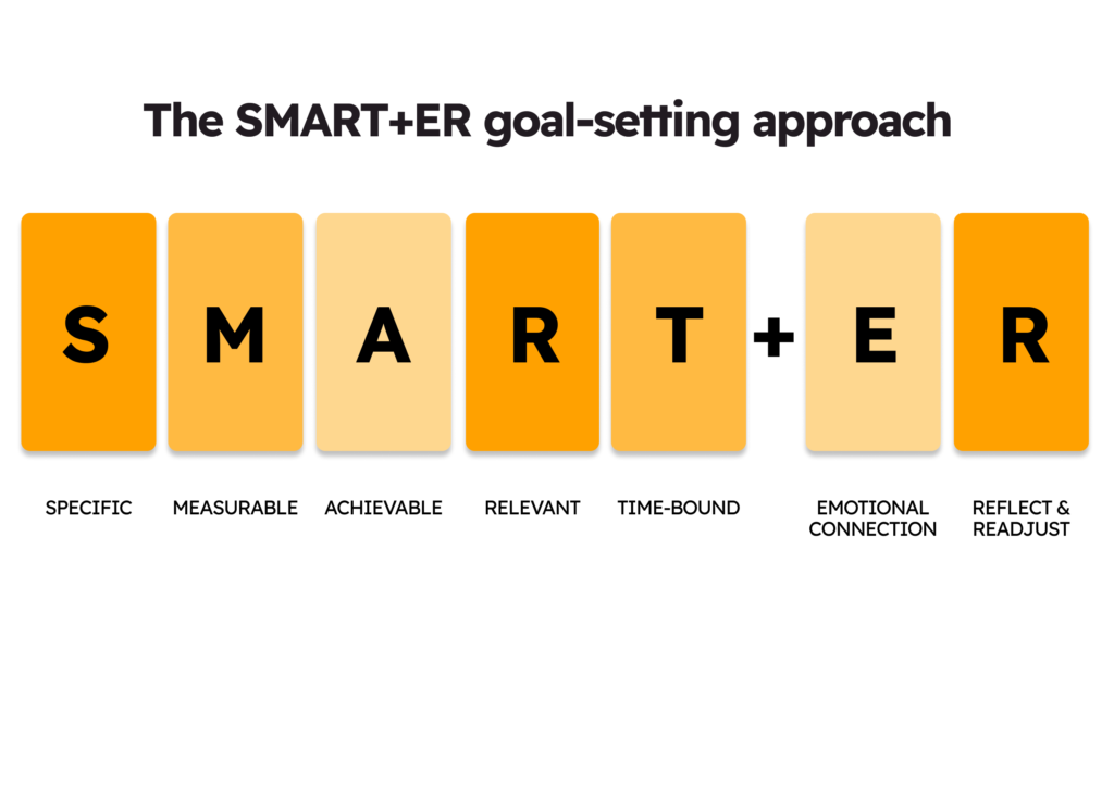 The traditional SMART (Specific, Measurable, Achievable, Relevant, Time-bound) acronym, while still useful, may need to adapt to the changing dynamics of our modern environment, hence adding the E (Emotional Connection) and R (Reflect and Readjust) to the formula.